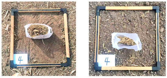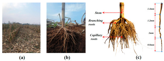 Selection of corn residue samples: (a) test site; (b) root section diagram; (c) sampling diagram.