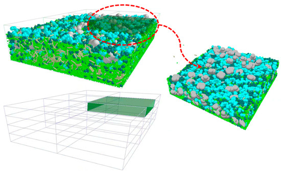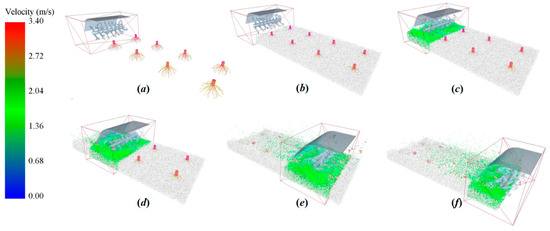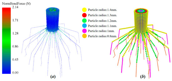 To enhance the accuracy of the discrete element model for soil–composite interactions and simulate the crushing effect of the rotary tiller on corn residue, we developed a flexible body model utilizing meta-particles. This model was developed based on the size parameters and morphological characteristics of corn residue. It comprises 1462 stalk particles and 1196 root particles, with the bonding links between particles illustrated in Figure 11a. We employed particles of varying radii to represent the dense, organized structure of corn stalks and the varying thickness of roots. Different colors were utilized to indicate particle sizes (Figure 11b). Table 1 lists the model parameters.