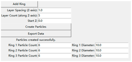 To address this issue, a static compilation software was developed to calculate the spatial positions of the particles, with its visualization interface demonstrated in Figure 12. First, the number of rings in the tangential plane is established to determine the radius and quantity of particles in each ring. Based on the corn stalk’s physical model, the structure becomes more compact towards the center, resulting in a decrease in particle radius centrally. Then, the radius and number of particles in each ring are calculated to ensure sufficient spacing between particles, avoiding overlap. Following this, the number of layers stacked along the z-axis is determined to increase the structure’s density while maintaining overall dimensions. Finally, the spatial coordinate data of the particles are generated.