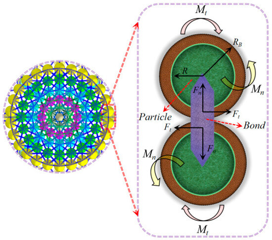 Particle contact model: Fn and Ft represent the normal and tangential contact force, respectively, N; Mn and Mt are the normal and tangential torque of particle, respectively, N·m; R is radius of particle, m; RB is the radius of Bond, m.