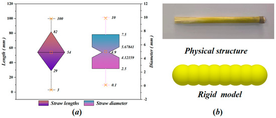 Extensive research has been conducted on the mechanical properties of rice and wheat straw, both domestically and internationally, leading to the establishment of well-founded models. In this study, the primary function of the rotary tiller is to bury the straw and stubble scattered on the surface during operation, rather than cutting or grinding them. Accordingly, the straw model developed for this study was simplified. A selection of straw samples was made, and their lengths and diameters were measured. A box plot (Figure 14a) demonstrates that the median length of the straw is 56 mm, while the median diameter is 5.3 mm. The model is developed utilizing a rigid structure, comprising straw particles with a density of 0.227 g/cm3, a Poisson’s ratio of 0.4, and a shear modulus of 1.0 × 106 Pa [24]. It consists of 8 particles, each with a radius of 5 mm, and the center-to-center distance between adjacent particles is 5.4 mm. The total length of the straw model is 54 mm, as illustrated in Figure 14b.