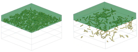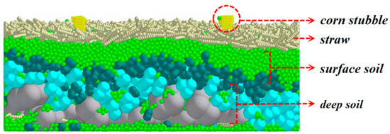 Considering the complex characteristics of corn residue and the various changes in its fragmented form, the Hertz–Mindlin with Bonding model is utilized to constrain the residue’s shape and accurately simulate the cohesion between particles, as well as the fragmented state of the corn residue during tillage. The formation of Bonding connections between particles is depicted in Figure 13. The contact forces between stalks, soil particles, and residues are described in reference [23].