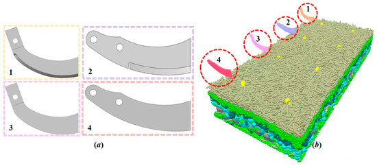 The discrete element method (DEM) has been extensively employed to appraise the interactions between soil, components, and machinery [8,9]. Current model development and simulation analyses primarily center on equipment such as crushers [10,11], deep loosening machines [12,13], and rotary tillers [14,15]. These studies are generally classified into two main categories, depending on their research objectives. One approach involves researchers utilizing existing DEM data to optimize the geometric structure of cutting tools. This method focuses on optimizing the edge curvature and sliding angle of rotary blades to evaluate their impact on soil disturbance characteristics, followed by adjustments to the blade body parameters [16]. The alternative approach involves the calibration of soil, straw, crops, and other elements, such as the modeling and calibration of corn stubble. This method allows for a more accurate simulation of shear and cutting processes during operation, thereby enhancing the reliability of discrete element simulation [17].