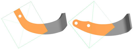 The handle profile consists of four curved segments, as depicted in Figure 9. The initial curve aligns tangentially with the blade’s back curve, facilitating a smooth transition while maintaining a minimum 20 mm distance from any point on the curve to the front bolt hole’s center. The second curve, an 80 mm diameter arc, corresponds to the blade axis size, ensuring a secure fit between the handle and axis. This arrangement offers support and distributes pressure from the front bolt hole. The third curve, a 20 mm radius arc concentric with the rear bolt hole, ensures that the handle edge remains at least 20 mm from the bolt hole’s center. The final curve, resembling the first, is tangent to the side cutting edge, ensuring a smooth structural transition.