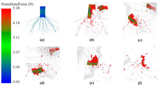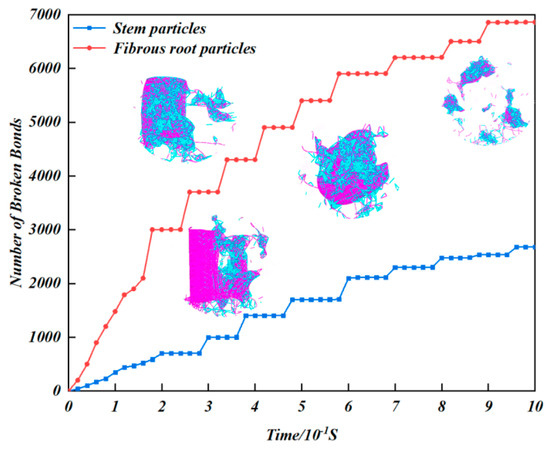 The corn residue flexible body model comprises two primary components: the stalk and the root hairs. These elements exhibit different bonding mechanisms and parameter configurations, resulting in unique bonding characteristics. The stalk is developed from spherical particles of varying radii arranged in a circular pattern. Each spherical particle typically forms at least three bonds with adjacent particles, creating a dense network of bonds. Statistical analysis indicates that the stalk contains a total of 12,268 bonds. In contrast, the root hairs consist of spherical particles with varying radii arranged linearly, forming single bonds between adjacent particles, resulting in a significantly lower total of 2788 bonds. The fragmentation of corn residue occurs primarily through bond rupture. To reduce experimental variability, bond fracture data were collected from ten corn residue models, recording the number of bond fractures in both the stalk and root hair regions and calculating average values. As presented in Figure 33, the bond fracture process initially progresses rapidly before decelerating and eventually reaching a plateau. The stalk experiences approximately 7000 bond fractures, representing 60% of its total bonds, while the root hairs exhibit approximately 2500 bond fractures, accounting for 90% of their total bonds. These findings suggest that during rotary tillage, the root hairs demonstrate superior fragmentation, whereas the stalk tends to retain larger, strip-like residues post-tillage. This residual material can be incorporated into the soil as fertilizer, aligning with practical operational conditions and tillage quality requirements.