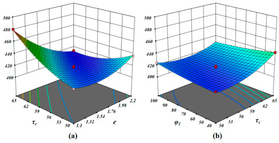 Response surface plot: (a) factor τc and e response surface; (b) factor τc and φ1 response surface.