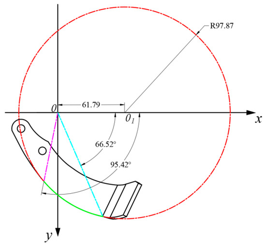 Arcs, being the simplest curves after straight lines, offer advantages in both representation and manufacturing processes. Theoretical analysis indicates that an eccentric circular edge can achieve the slip performance of various blade curves [18]. Moreover, the slip angles at different positions on an arc can be determined through relatively simple methods, significantly facilitating blade manufacturing and performance analysis. After analyzing the side cutting-edge design curves of other tool types, including rotary blades, stubble breakers, and reclamation blades, it was determined that the rotary tiller side cutting-edge design would utilize an eccentric circular curve. The following section will offer a detailed explanation of the characteristics and design principles of the eccentric circular cutting-edge curve.