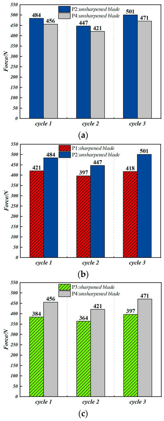 Figure 28 presents the cutting resistance results, illustrating the maximum cutting resistance of IT260 and RA rotary blades in both sharpened and unsharpened conditions across three cutting cycles. As illustrated in Figure 28a, the unsharpened IT260 and RA rotary blades exhibit average maximum cutting resistances of 477 N and 449 N, respectively, indicating a 5.9% decrease. This observation verifies the eccentric circle side cutting-edge theory. Figure 28b indicates that the IT260 rotary blade’s average maximum cutting resistance drops from 477 N in the unsharpened state to 412 N when sharpened, marking a 13.6% reduction. Comparatively, Figure 28c demonstrates that the RA rotary blade’s average maximum cutting resistance decreases from 449 N to 381 N after sharpening, representing a 15.1% reduction. The more significant decrease in cutting resistance exhibited by the RA rotary blade implies that the newly designed cutting angle is more efficient in reducing resistance.