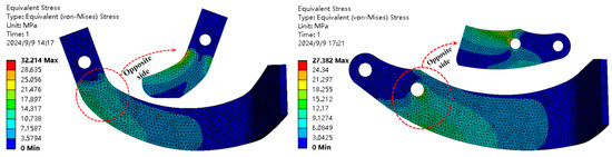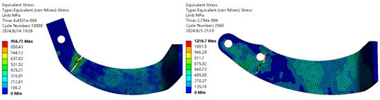 Figure 32 illustrates the ultimate fracture stress contour map. Fractures occur at the blade’s neck in both rotary blades. The color map indicates that at the moment of fracture, most of the IT260 blade’s handle is blue, suggesting it experienced relatively low stress. However, a green–yellow–red band near the handle’s end at the neck indicates stress concentration in this area, leading to fracture. In contrast, the RA rotary blade’s handle demonstrates a wider color spectrum at fracture, with overlapping blue, green, and yellow hues. This suggests that during crack formation, the handle effectively distributed stress, alleviating pressure from the neck and contributing to stress distribution and protection.