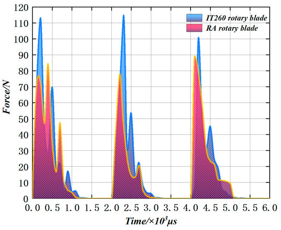Figure 30 illustrates the force variation observed in the IT260 and RA rotary blades during monitoring. To ensure result consistency, the force variation across three cutting cycles is presented. Both tools exhibit broadly similar working cycles, with peak forces occurring at similar points. Focusing on the stress concentration areas (the handle and neck), the IT260 rotary blade registers a maximum force of 114.67 N over the three cutting cycles, with an average maximum force of 109.33 N. In contrast, the RA rotary blade demonstrates a maximum force of 88.45 N and an average maximum force of 83.67 N. The neck of the IT260 rotary blade is subject to higher forces with more significant fluctuations, while the RA rotary blade experiences lower forces with more consistent peaks. Specifically, the RA rotary blade’s maximum force is 22.9% lower than that of the IT260, and its average maximum force is reduced by 23.5%. These findings indicate that the handle design of the RA rotary blade is effective, meeting design expectations and indicating consistent performance across multiple cycles.