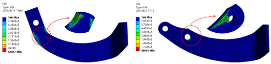 Considering the actual surface roughness and potential microscopic damage of the blade, we set the fatigue strength factor (KF) to 0.8 [31]. We import the random cyclic load measured by EDEM software as historical data, adjusting the scale factor to 1.5. The material’s S–N curve and load spectrum are then corrected for mean stress utilizing the built-in program, followed by a fatigue life analysis. Figure 31 presents the resulting fatigue life contour map. This map indicates that under high-cycle fatigue loading, the neck of the IT260 rotary blade reaches its fatigue limit first, while the RA rotary blade demonstrates a fatigue limit in the area above the first screw hole at the connection to the blade back. When subjected to the same cyclic load, the fatigue life of the IT260 and RA rotary blades is measured in cycles, with values of 61,887 and 86,074 cycles, respectively, indicating a 39.08% increase. These findings suggest that the RA rotary blade design significantly extends its service life and lowers the risk of fracture.