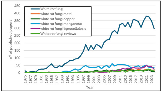 The wide range of applications of WRFs has made them a broadly studied topic over the last 50 years (Figure 1). As can be seen, scientific interest in the field continues to grow, with the number of publications in the area increasing year after year. Most of the published studies in relation to WRFs focus on application processes, either in evaluating the degradation capacity of xenobiotics or [8,9,10] bioremediation processes [11,12,13], and to a lesser extent, on the integration of WRF with other technologies such as hydrogen production [14] or composting [15,16].