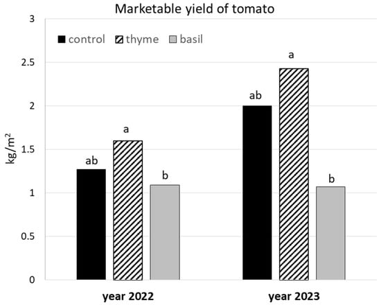 The marketable yield of tomato plants intercropped with thyme and basil in the years 2022 and 2023. The same letters above the bars in each year indicate not significant differences at p = 0.05 according to DMRT.