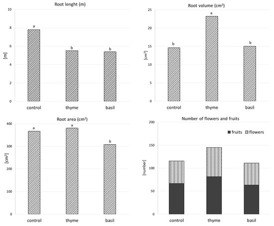 A certain effect of intercrops could be observed on the tomato biomass; in the presence of thyme, the tomato root system was on average about 30% heavier than the control plants (on average, 1.14 kg in the thyme vicinity and 0.78 kg on the plots without herbs). Thyme also caused the increase in fruit and flower numbers compared to basil and the plots without herbs (Figure 2). For example, the number of the tomato fruits on plants intercropped with thyme was 81.7, while in the control, it was 66.8, and in the case of flowers, it was 63.5 and 49.0, respectively. Basil did not have a significant effect on the aboveground parameters of tomato plants compared to the control.