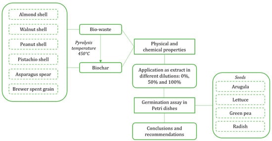 The main objective of this work was to evaluate the phytotoxicity of different biowaste and biochar obtained by pyrolysis, from six agro-industrial biowastes: almond (Alm), walnut (Wal), peanut (Pea), pistachio shells (Pis), asparagus spear (Asp), and brewer spent grain (Bre), and on seed germination and seedling growth of four different species: green peas (Pisum sativum L.), lettuce (Lactuca sativa L.), radish (Raphanus sativus L.) and arugula (Eruca sativa M.), under laboratory bioassay conditions. For this, biochar and their raw materials were incorporated in different proportions in aqueous extracts (0, 50, and 100%). The aqueous extracts obtained were used for germination tests in the different types of seeds. It is noteworthy that the novelty of this work lies in its comprehensive approach, which encompasses a diverse range of biomass sources, the utilization of pyrolysis, the assessment of multiple plant species, and a focus on early-stage plant development under controlled laboratory conditions. The findings of this study could contribute valuable insights into the phytotoxicity of biochar derived from agro-industrial biowaste, with potential implications for sustainable agricultural practices. A logic diagram of the study is shown in Figure 1.