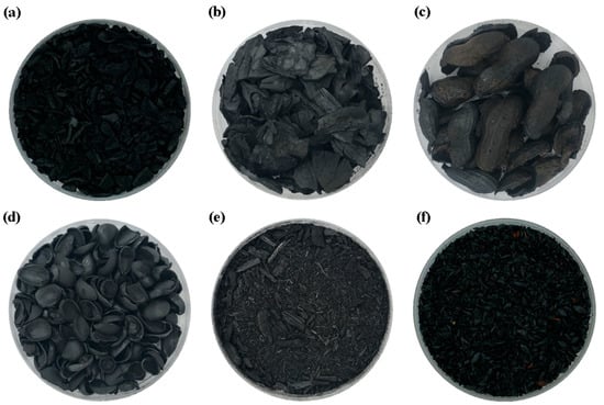 Biochars: (a) AlmB, (b) WalB, (c) PeaB, (d) PisB, (e) AspB, and (f) BreB.