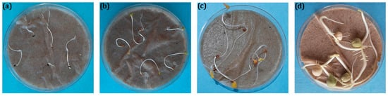 Photographs taken at the end of the Petri dish assay. Horticultural seeds emerging in control extract: (a) Lactuca sativa, (b) Eruca sativa, (c) Raphanus sativus, and (d) Pisum sativum.