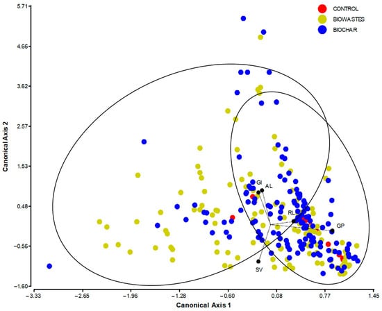 Relationships between biomass and biochar types and control and their influence of variables (GI, GP, SV, AL, and RL) with discriminatory potential through a multivariate statistical procedure, such as linear discriminant analysis (LDA).