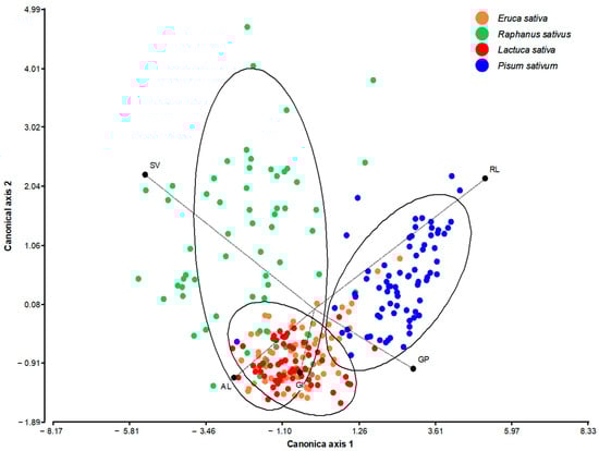 Seed response to the different biowaste and biochar extracts varied significantly by species (Figure 6). Canonical axis 1 explained 77.73% of the variation between groups, and axis 2 explained 21.87%. This figure shows how radish (Raphanus sativus L.) and green pea (Pisum sativum L.) seeds were positioned on opposite sides, influenced by differences in RL and SV. The total classification error rate was 29%, with pea seeds being the least sensitive to treatments, while radish and lettuce (Lactuca sativa L.) seeds showed more inhibition in germination (Tables S1–S4, Supplementary Materials).