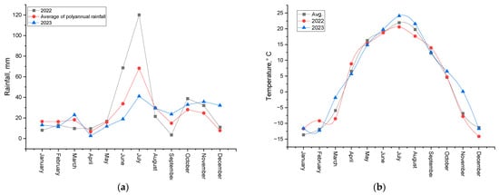 Sum of precipitation (mm) during the study period 2022–2023 compared to the (2013–2023) multiyear rainfall (a) and average temperatures (°C) (b).