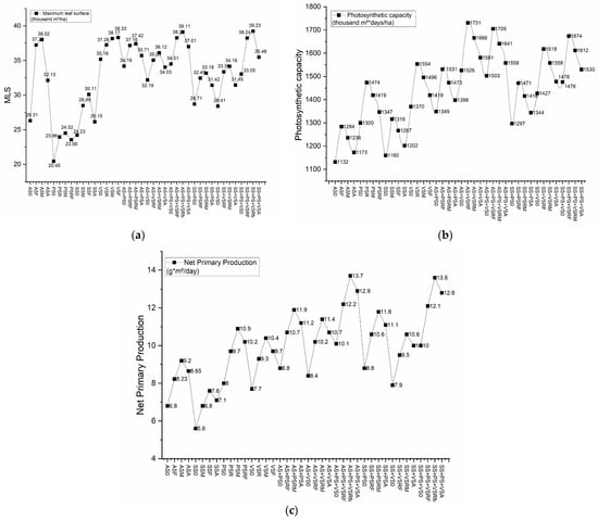 The effect of biopreparations on (a) leaf area, (b) photosynthetic capacity, and (c) net primary production of annual grass mixtures. The complete table is presented in the Supplementary Materials.