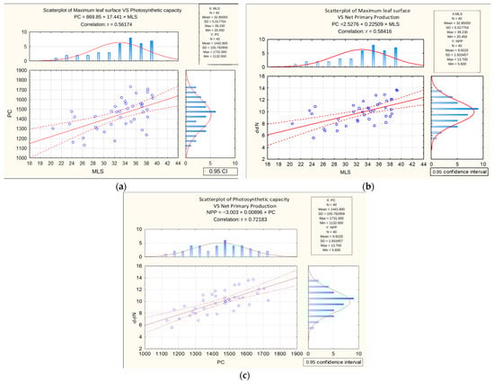 The results of the statistical analysis demonstrating the correlation dependence are presented in Figure 4, which shows data indicating a positive correlation between the maximum leaf surface (MLS), photosynthetic capacity (PC), and net primary production (NPP). An especially strong correlation is observed between PC and NPP, highlighting the significant role of photosynthetic capacity in enhancing overall plant productivity.