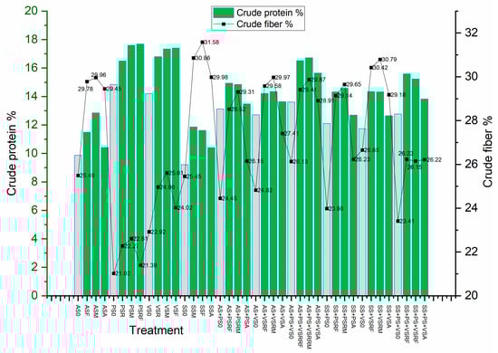 Content of crude protein and crude fiber in grass mixtures. Here and throughout the figures, grey represents the control variants (untreated) for each grass mixture. The complete table is presented in the Supplementary Materials.