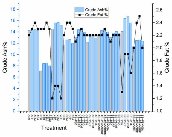 The analysis of crude fat and ash content in this study is crucial for assessing the energy density and mineral composition of the forage, both of which are essential for optimizing feed quality and ensuring balanced nutrition for livestock. The content of crude ash and crude fat in grass mixtures is presented in Figure 8.
