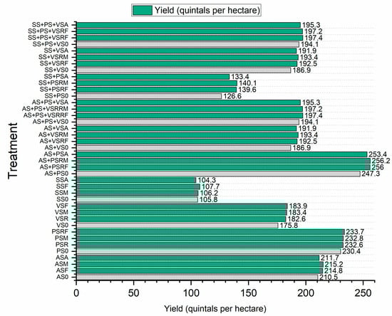 Oats (Avena sativa) showed a slight increase in crude fat with Mizorin treatment, reaching 2.4%, compared to 2.2% in the untreated variant. Similar increases were observed in other inoculated variants. Peas (Pisum sativum) treated with Mizorin had the highest fat content (2.4%), whereas untreated peas showed 2.3%. These differences were marginal across inoculation treatments. Vetch (Vicia sativa) had consistently lower crude fat levels compared to oats and peas, with untreated vetch showing only 1.2%, which increased slightly to 1.4% with Rizotorfin and Mizorin. Mixtures of Sudan grass (Sorghum sudanense) with other legumes also showed limited variation in fat content, with values around 2.2%, although Sudan grass combined with vetch exhibited a drop in crude fat in untreated variants (1.3%). The ash content was significantly affected by inoculation. For example, vetch treated with Mizorin and Rizotorfin had the highest ash content (15.7%), while untreated vetch showed lower values (14.5%). Peas also showed increases in ash content with inoculation, with the combination of Rizotorfin and Mizorin producing an ash content of 8.5%, compared to 7.1% in the untreated variant. Sudan grass combinations generally displayed higher ash content, particularly with vetch, reaching 16.8% with Mizorin and Rizotorfin inoculation, compared to 14.1% in untreated variants. The inoculation of grass mixtures generally led to an increase in yield compared to untreated variants, with some inoculants performing better than others (Figure 9). Mizorin and Rizotorfin combinations were particularly effective across different mixtures.