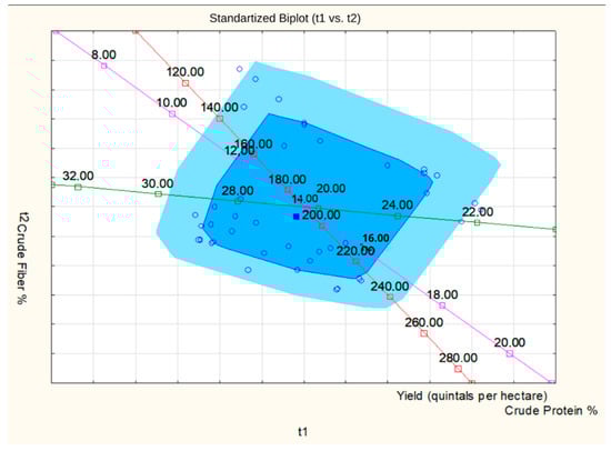 Biplot depicting the relationship between yield (quintals per hectare) and crude protein and fiber content.