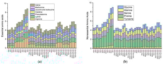When determining the amino acid composition of the studied legume–cereal mixtures, our study found that the amino acid content in plants varies significantly depending on the species composition and the ratio of legume and cereal components; to a lesser extent, changes were found in inoculated variants. The composition and mass fraction of amino acids of the annual legume–cereal mixtures are presented in Figure 11.