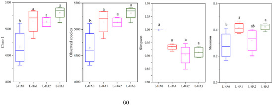 Alpha diversity (α-diversity) of soil bacterial (a) and fungal (b) communities under different L-HA treatments. Data are means ± SE (n = 4). In each plot, different lowercase letters show statistically significant differences (p < 0.05). L-HA0, L-HA1, L-HA2, and L-HA3 represent L-HA application rates at 0, 2, 4, and 6 ton·ha−1, respectively.