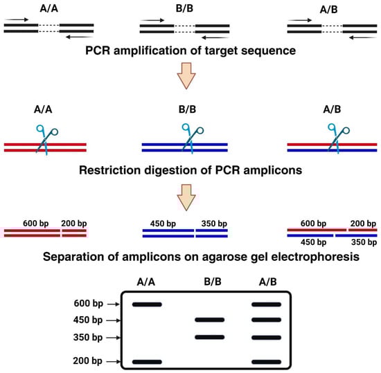 Schematic representation of CAPS assay. A typical CAPS assay consists of three main steps, (1) PCR amplification of target sequence, (2) subsequent digestion with restriction enzymes, and (3) separation of digested PCR products on an agarose or polyacrylamide gel electrophoresis. CAPS are codominant markers and clearly distinguish homozygous (A/A or B/B) and heterozygous (A/B) alleles, as shown in this figure.