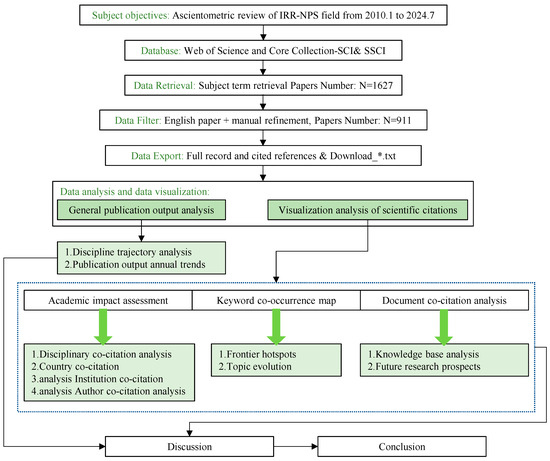 Focusing on the main source of pollution is based on surface source pollution generated in the process of agricultural irrigation. Therefore, irrigation-related NPS pollution (IRR-NPS) is analyzed in this paper. To be specific, bibliometric analysis is conducted using the CiteSpace 6.1.R6 software tool to systematically review the literature on the impact of agricultural irrigation on NPS pollution. First, the research literature on agricultural irrigation and NPS pollution from 1976 to the present is collected. Then, the data are processed and visualized with CiteSpace. Furthermore, the research hotspots and development trends of different irrigation methods are analyzed to reveal their impact mechanisms on NPS pollution. Finally, the results of the literature analysis are discussed to propose sensible recommendations on irrigation management and pollution control measures, providing theoretical support and practical guidance for the future practice of agricultural NPS pollution management [18,19].