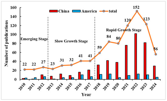 As a significant indicator of activity and development trends in a particular field [34], the annual publication number is useful for analyzing research trends, understanding distribution patterns, evaluating index status, co-authorship conditions, and identifying research hotspots [35]. According to the number of articles and reviews on IRR-NPS published from 2010 to July 2024 (Figure 3), there is a relationship between the collected data and the annual publication number of relevant countries. Overall, the publication number has increased steadily over time, despite a slight decline in 2013, 2015, 2017, and 2020. The largest number of publications was recorded in 2022, indicating the increased attention paid to the issues with improved irrigation and NPS pollution reduction. The scope of IRR-NPS research is expanding.