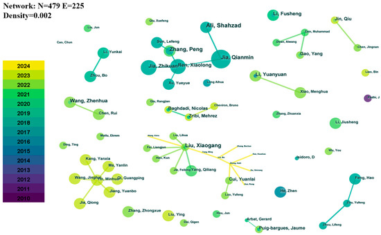 The co-authorship visualization (Figure 4) involves 479 nodes and 225 links, with a density of 0.002. This reflects the level of collaboration and knowledge exchange among authors in the research field. In this context, a density of 0.002 suggests relatively sparse connections between nodes. That is to say, the actual established connections are outnumbered by the total potential connections in the network. This implies a pressing need to promote cross-institutional and cross-disciplinary collaboration, establish tighter cooperation networks, and address the challenges in the field collectively for the ultimate improvement in research efficiency and depth.