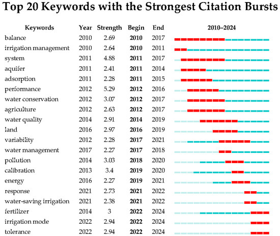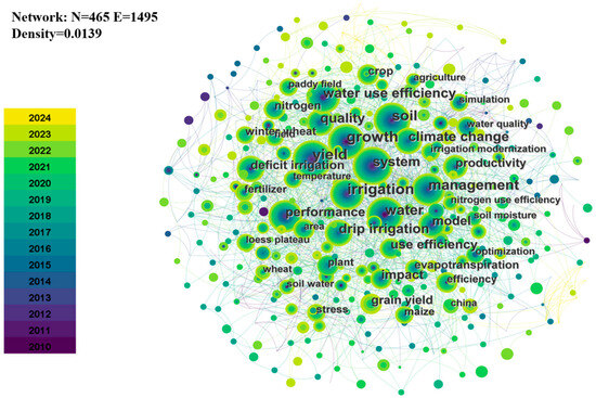Between 2010 and 2014, the keyword timeline view focused on keywords related to traditional agricultural management and irrigation technology, such as management, water use efficiency, evapotranspiration, and transpiration. Irrigation technologies and water quality models advanced with the improvement in understanding the growth mechanisms of different crops and the exploration of water and fertilizer management practices. From 2014 to 2024, sensor controllers continued to advance, which was accompanied by a shift to more specific technologies such as drip irrigation, climate change impacts, quality, efficiency, and nitrogen and fertilizer use. It is suggested that the research conducted in the years after 2014 is more focused on how to improve efficiency and address the challenges posed by climate change.