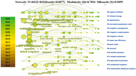 For a better understanding of the research hotspots and future directions in this field, the keywords with similar themes and clear evolution paths were categorized into four topics. The first one focuses on irrigation water resource management, including clusters #4 Irrigation Management, #5 Irrigation Modernization, #6 Irrigation Volume, #7 Water Use Efficiency, and #13 Residential Irrigation. The primary years of research carried out on these topics are 2018, 2017, 2013, and 2014. The second one revolves around the management of agricultural production practices, involving clusters #0 Organic Fertilizer, #8 Grain Yield, #12 Agricultural Practices, and #14 Multivariate Statistical Analysis, with key years being 2016, 2019, 2016, and 2012. The third one is centered on examining various environmental impacts, including clusters #1 Climate Change, #2 Optimization, #3 Microbial Desalination Cells, and #11 Treated Wastewater, with the primary years of research including 2018, 2017, 2017, and 2015. The fourth one explores the patterns of plant growth, focusing on clusters #9 Removal and #10 Rainfall Simulator, with significant research activity performed in 2020 and 2019.