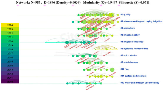 A co-citation relationship is formed when multiple documents are cited by the same paper (Figure 8). Citation counts are considered a crucial indicator of quality and academic attention for a document, and highly cited papers often exert significant academic influence. Co-citation relationships can be analyzed to reveal the knowledge structure and system of a specific research field [73]. A majority of co-citation nodes appear after 2015 (except for #5 Irrigation Methods), as irrigation methods are essential for precision irrigation and IRR-NPS research. The following perspectives are considered to improve the accuracy of the analysis: chronological order, citation frequency, and time span.