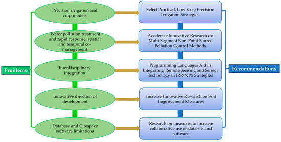 Overall, this study provides theoretical support for IRR-NPS control and practical guidance for technology application and policy formulation. The results are expected to contribute to sustainable agricultural development and environmental protection by reducing technology costs, promoting regionally adaptive strategies, and enhancing interdisciplinary cooperation. Future research should focus on precision irrigation, crop models, data accuracy, spatiotemporal pollution management, and integrated interdisciplinary solutions.