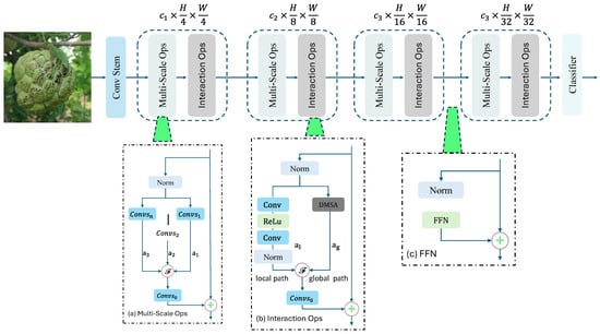 Enhanced Multi-Scale and Global-Local Feature Interaction: The model integrates a multi-scale module and an interaction module, effectively capturing both global context and local features, improving the model’s ability to identify complex disease patterns in leaves and fruits.
