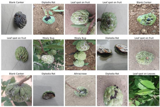 Annona squamosa, also known as sugar apple, sweet apple, and cream apple, is a tropical endemic species and one of the most important fruits in the tropical region of China, with a unique flavor, rich nutrition and a broad market development prospect []. Fruit cultivation is a cornerstone of global agriculture, contributing significantly to both food security and the economy []. However, the productivity and quality of fruits are under constant threat from a wide range of plant diseases. Early identification and proper management of these diseases are critical for reducing crop losses and ensuring food supply stability. Traditional methods of plant disease detection, which rely heavily on expert knowledge, are time-consuming and prone to human error []. As a result, there has been a shift toward automated systems that utilize artificial intelligence (AI) and machine learning (ML) to improve accuracy and efficiency in disease identification [].