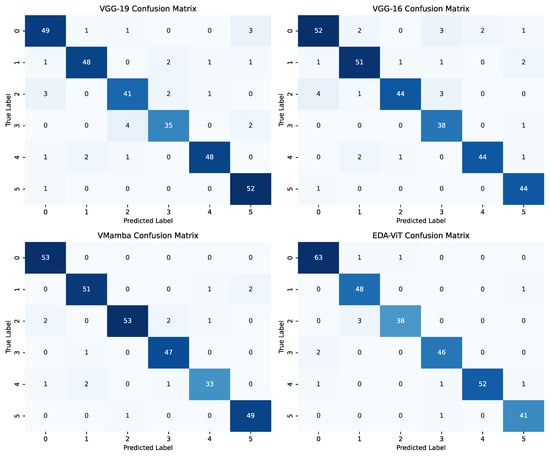 Figure 4 presents the confusion matrices for the best-performing models (EDA–ViT and VMamba) and the worst-performing models (VGG-16 and VGG-19). These results were obtained by randomly selecting 300 samples from the test set for each run. The matrix indices 0 to 5 correspond to the categories Anthracnose, Blank Canker, Diplodia Rot, Leaf Spot on fruit, Leaf Spot on leaf, and Mealy Bug, respectively. The proposed EDA–ViT model demonstrated superior performance across all categories, particularly excelling in recognizing Diplodia Rot (38) and Leaf Spot on leaf (52). According to the analysis of Figure 3, images in the Diplodia Rot category often include both leaves and infected fruit, creating cross-category features that are more challenging to distinguish. The interaction module in the proposed model, DMSA, enhanced the influence of local information, while context-aware data from the local path facilitates the differentiation between these overlapping features. VMamba, while utilizing a cross-scanning module (CSM) to achieve a global receptive field, struggled with distinguishing cross-category information when operating at this level. In contrast, the adaptive entropy data augmentation in EDA–ViT allowed for dynamic feature enhancement without constraining the hierarchical feature representations, leading to improved performance. The VGG models exhibited relatively poorer performance. Although VGG-19 incorporates additional layers compared to VGG-16, the improvement is marginal. VGG-19 shows a higher misclassification rate for Diplodia Rot (6), and similarly, VGG-16 has a high error rate for Anthracnose (6). The misclassification rate for each class was calculated as: (FP + FN)/total instances of that class. The highest error rates for VGG-19 and VGG-16 are 2.0% and 2.67%, respectively, while EDA–ViT and VMamba achieved maximum error rates of 0.32% and 1.68%, respectively. Overall accuracy alone does not fully capture model performance. A deeper analysis of category-specific error rates through the confusion matrix offers a more detailed understanding of the strengths and weaknesses of each model.
