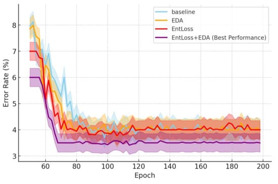 EDA–ViT improved performance through adaptive entropy-based data augmentation and entropy regularization loss. Figure 5 demonstrates that, compared to baseline training, the combination of EntLoss and EDA yielded a positive effect, with a significant reduction in the overall error rate.