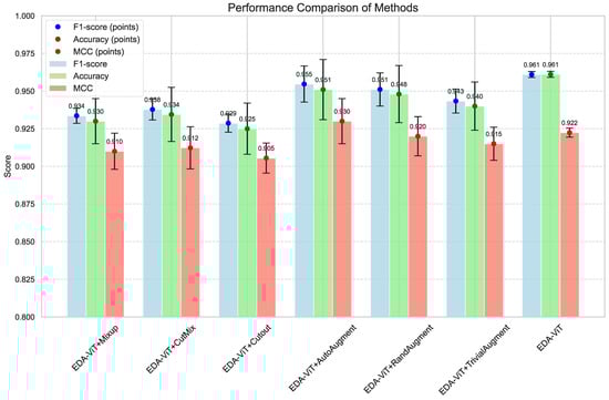 In this section, data augmentation experiments were conducted on the proposed EDA–ViT to compare the performance of adaptive entropy-based data augmentation. As shown in Figure 6, EDA–ViT consistently outperformed other models across all experiments, achieving an accuracy of 0.961 ± 0.002, indicating its high stability and robustness in classification tasks. The MCC score of EDA–ViT was 0.922 ± 0.003, highlighting its exceptional ability to handle imbalanced data. In comparison, models incorporating AutoAugment and RandAugment strategies also exhibited strong performance. EDA–ViT with AutoAugment achieved an accuracy of 0.951 ± 0.020, which was close to the performance of the original EDA–ViT, demonstrating the effectiveness of AutoAugment in improving the model’s generalization capabilities. EDA–ViT using RandAugment followed closely with an accuracy of 0.948 ± 0.019, showing that RandAugment could also significantly enhance classification performance. The Cutout augmentation strategy showed slightly weaker results, with an F1-score of 0.928 ± 0.006 and an accuracy of 0.925 ± 0.017. This relatively lower performance could be attributed to the Cutout technique, which randomly masked certain regions of the image. In datasets like Diplodia Rot and Leaf Spot on fruit, which contain other key features, the advantage of masking becomes less apparent when non-essential areas are obscured. Overall, the EDA–ViT model demonstrated high performance both in its original form and when combined with various data augmentation strategies.