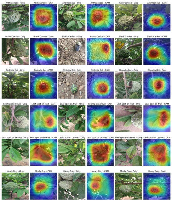 This visualization technique provides insights into the decision-making process of plant disease classification models, highlighting the capability of EDA–ViT to identify and localize specific disease features across different plant structures and pathologies. The consistency between visually evident symptoms and the CAM-highlighted regions suggests that the model had learned to focus on clinically relevant areas to accurately diagnose diseases in custard apple crops.