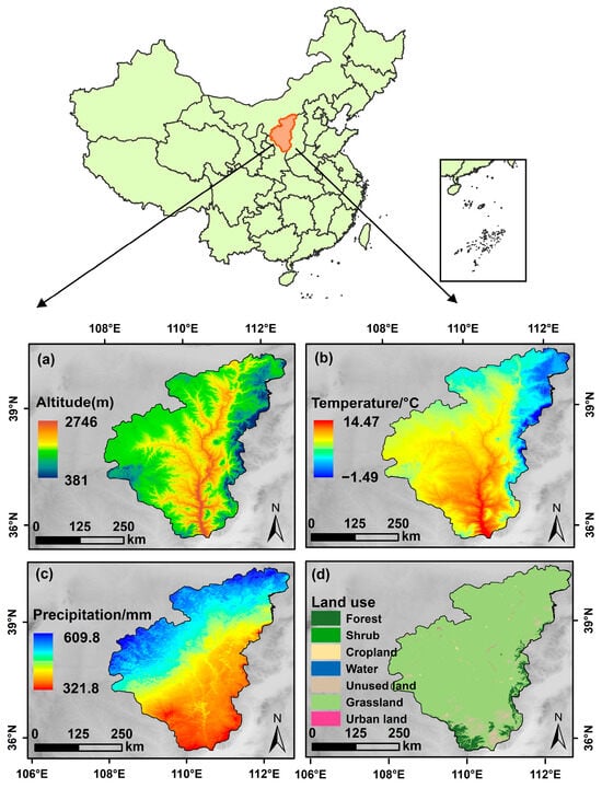 The HLS is the area between Hekou Town and Longmen in the middle reaches of the Yellow River in China. It is located between 35°40′−40°34′ N and 108°02′−112°44′ E, with an area of 112,900 square kilometers [24]. The terrain of the HLS is more complex, from the southern trough (381 m) to the northern high mountains (2746 m). This obvious elevation gradient has an important impact on the climate and vegetation distribution in the region [23]. The HLS has a temperate continental monsoon climate. The temperature is low in the northern mountainous area, with a minimum of −1.49 °C, while the temperature is high in the southern trough area, up to 14.47 °C. The precipitation in the northern region is relatively high, with a maximum of 609.82 mm, while the precipitation in the southern region is relatively low, with a minimum of 321.89 mm. The area is dominated by grassland, accounting for most of the area (91.82%), in addition to some woodland, shrubland, cultivated land, and water area (Figure 1).