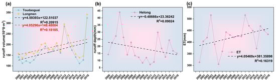 ET calculated by the water balance method in the HLS from 2000 to 2018. (a) The annual average runoff and its trend at the upstream and downstream gate stations. (b) The regional runoff of the HLS, obtained by subtracting the runoff of the upstream Toudaoguai station from the runoff of the downstream Longmen station. (c) The regional ET of the HLS, obtained by subtracting the regional runoff from the regional precipitation according to the water balance method.