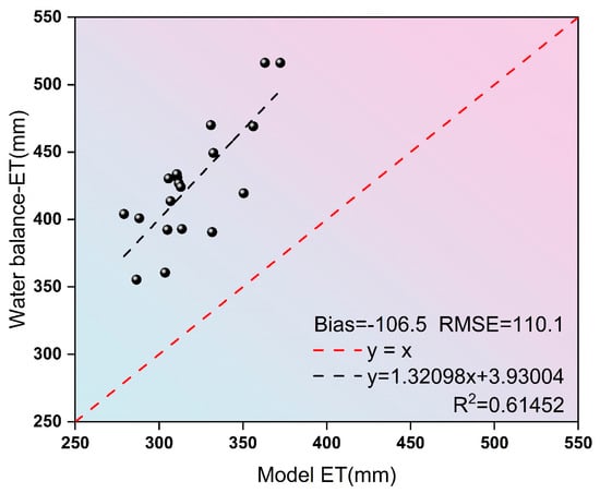 The results for ET simulated by PT-JPL and the water balance method (including Bias, RMSE, and linear fitting R2 as indicators) are verified.