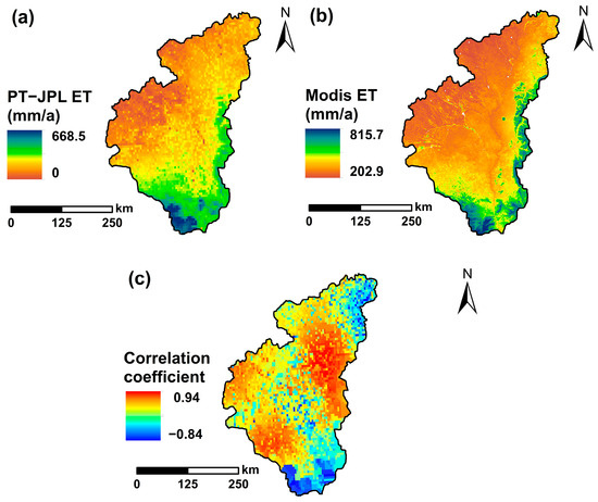 ET simulated by the PT-JPL model was verified by Modis ET. (a) Average ET simulated by the PT-JPL model from 2000 to 2018; (b) average Modis ET, 2000–2018; (c) the correlation between the multi-year average ET simulated by the PT-JPL model and the multi-year average ET of Modis was analyzed.